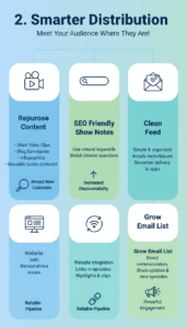 Turn each episode into several assets. Make a short video podcast clip. Write a simple blog-style summary. Create an infographic. Share quotes with hashtags on LinkedIn. These pieces bring in potential listeners and a new audience without recording more.